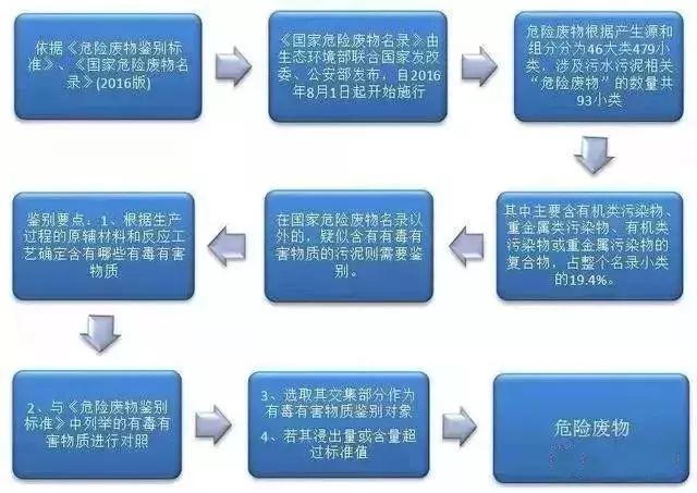 依據(jù)由環(huán)境保護部聯(lián)合國家發(fā)改委、公安部發(fā)布自2016年8月1日起開始施行的《國家危險廢物名錄》(公眾號內(nèi)回復”危廢名錄“下載)和《危險廢物鑒別標準 通則》,結(jié)合住建部、環(huán)保部、科技部于2009年2月28日聯(lián)合發(fā)布的《城鎮(zhèn)污水處理廠污泥處理處置及污染防治技術(shù)政策(試行)》,五步即可判定污水污泥是否屬于危險廢物,如下圖所示: